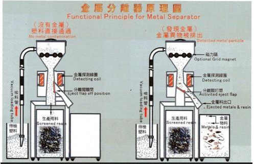 金屬分離器作用于檢測和分離混在塑料、水品料、再生料、化工原料、食品原料等行業(yè)中的所有金屬,包括鐵類及非鐵類金屬(如銅、鋁、不銹鋼)等。由于原料在加工過程中會(huì)有金屬雜質(zhì)混在其中,特別是不銹鋼,最終進(jìn)入生產(chǎn)發(fā)生事故,增加了停機(jī)保養(yǎng)次數(shù),而導(dǎo)致成本增加,并且影響生產(chǎn)效率。嚴(yán)重者進(jìn)入成品流通到消費(fèi)者導(dǎo)致安全事故發(fā)生引起巨額索賠。